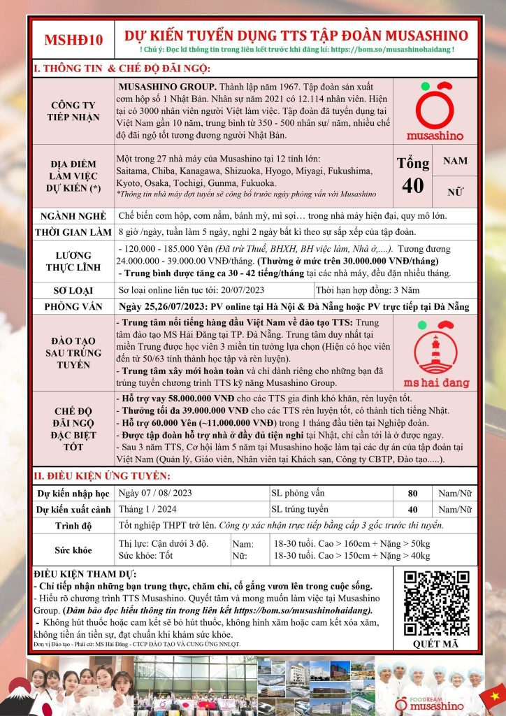 ??Tuyển dụng thực tập sinh đơn hàng thực phẩm Musashino tháng 07/2023 ?? ??MS Hải Đăng đã sẵn sàng chào đón các ứng viên HD10 ?Làm việc tại tập đoàn sản xuất cơm hộp số 1 Nhât Bản – Musashino. ?Số lượng: 40 Nam/Nữ ?Ngành nghề: Chế biến cơm hộp, bánh mỳ, mì sợi, thức ăn[…]